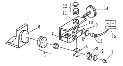 圖 2—20 儀 器 光 學 系 統 1-光源;2-聚光鏡;3-分劃板;4-立方直角棱鏡;5-物鏡;6-反射鏡;7-振子;8-聚光鏡;9-狹縫;10-分光鏡;11-刻度分劃板;12-目鏡;13-光電元件; 14-測微鼓輪;15-指示電表