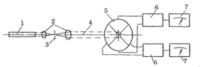 圖 2—21 激光準直儀工作原理 1—氦氖激光器 2—平行光管 3—針孔光闌 4—激光束 5—光電探測器(四象限靶) 6—運算電路 7—指示電表