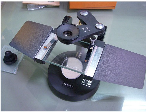 兩邊有金屬板可以把手放在上面操作,鏡頭是直接放在旋轉(zhuǎn)臂上,底下還有反光鏡。如果要用落射光,還可以把透明玻璃板的載物臺(tái)換成毛玻璃的。