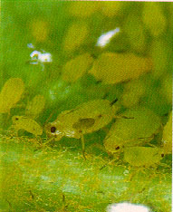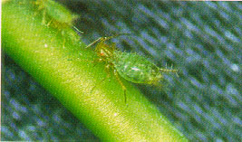 外形特征:無翅胎生成蟲體黃綠色,尾片下半部有側毛12、13根。腹管較尾片長,觸角6節。尾片褐色。
